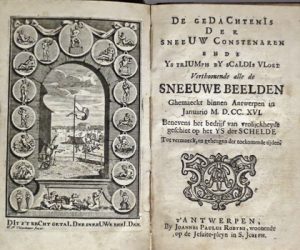 (Littérature populaire) - De gedachtenis der sneeuw constenaren ende ys triumph by Scaldis vloet [...]. t' Antwerpen, Joannes Paulus Robyns, 1716. In-8° : [gegrav. titel]-18-7-[1] pp. (doorschoten exemplaar, enkele vlekken). 19e eeuwse band : groen...