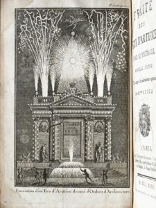 Seconde édition, entièrement revue et présentée en trois parties : preparation et composition des feux, utilisation, modèles de compositions pour réjouissances populaires et théâtre. Tombé amoureux des feux d'artifices lors du spectacle donné en 1697 à l'occasion de la Paix de Rijswijck, l'auteur chercha à se documenter sur la matière dans les ouvrages militaires (dont celui, trop digressif à son gout, de Casimlir Siemnienowicz) et dans les "Récréations mathématiques" de Henrion. En 1705 parait l'édition originale mais une seconde édition est demandée à l'auteur suite à l'intérêt du public, ravivé par le magnifique feu d'artifice conçu le 26 aout 1739 à l'occasion du mariage d'Élisabeth de France, aïnée chérie des jumelles de Louis XV, avec le futur Philippe V d'Espagne. Sans matière nouvelle à proposer, Frézier laissa traïner l'offre mais, en 1741, le librairie hollandais Neaulme débitait une seconde édition non autorisée et, en 1745, Jean-Charles Perrinet d'Orval (à qui on attribue souvent cet ouvrage) publiait son "Essai sur les feux d'artifice", sans partie historique ni "convenances des décorations des théâtres". Entre-temps, l'annonce de la nouvelle édition de son ouvrage avait été publiée en 1742 dans le "Mercure de France" et en 1745 dans les "Mémoires d'artillerie" de Saint-Rémy. Finalement, en 1747, paraït cette seconde édition qui corrige en partie l'ouvrage de Perrinet ("j'espère qu'il ne le trouvera pas mauvais en échange de ce qu'il avoit tiré du mien"), donne des nouveautés et est illustrée d'1 frontispice, 3 bandeaux historiés gravés par Charles-Nicolas Cochin et 13 pl. dépliantes in fine.