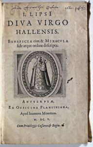 (Dévotion, Culte marial & Pèlerinage) - LIPSE, Juste.- Diva Virgo Hallensis. Beneficia eius & miracula fide atque ordine descripta. Antverpiae, ex officina Plantiniana, apud Joannem Moretum, 1605. In-8° : 94-[11] pp. (lég. bruni, galeries ou...