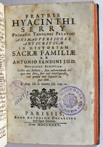 SERRY, Jacques-Hyacinthe.- Animadversiones anticriticae in historiam sacrae familiae ab Antonio Sandini J.U.D. novissime scriptam [...]. Parisiis, apud Antonium Dezallier, 1735. In-8° : 152 pp. (nombreuses pet. rouss.). Rel. de l'époque : plein...