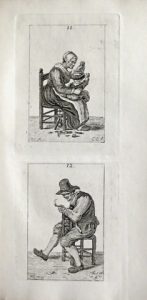 Berijming (1ste uitgave : 1779) door de Leidse prozaschrijver Le Francq (1729-1812) van een reeks fijn gegraveerde volkstypes naar de Amsterdamse kunstenares Christina Chalon (1748-1808), zeer bekend voor haar landschappen en boerentaferelen, hier in 3de uitgave. Geïllustreerd met 32 kopergravures (evenveel als in de 1ste uitgave) op 26 platen, van belang voor de kennis van gewoonten, kleding en interieur van de 18de eeuwse boerenbevolking. # van der Steur 328 (ed. 1793). fl Recueil des vers accompagnant 32 gravures, sur 26 planches d'après la graveuse Christina Chalon, représentant des paysans et leurs moeurs. Broché (mouillures aux premières pp., rel. frottée et us., dos cassé).