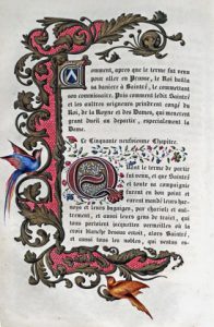 Exemplaire unique dont l'illustration imprimée, d'inspiration médiévale, a été entièrement rehaussée à l'aquarelle et or, soit 4 grandes miniatures, 7 grandes lettrines, bandeaux historiés ou compositions décoratives, de nombreuses lettrines et près de 500 pages avec bordures (parfois identiques mais mises en couleurs différemment). Le tirage courant n'est pas orné de bordures mais il existe sans doute un tirage de tête avec bordures en noir.
