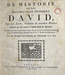 (Littérature populaire) - [VAN THIENEN, Franciscus].- De historie van den koninglyken propheet David [...]. Gend, J. Begyn, [c. 1808]. In-4° : 87-[1] pp. (sporadische vlekjes, herkomsstempel op titel). Moderne band : halfperkament, gemarmerde...
