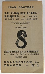Ens. 1 ouvr. et 5 doc. - COCTEAU, Jean.- Le Coq et l'Arlequin. Notes autour de la musique. Avec un portrait de l'auteur et deux monogrammes par P. Picasso. Paris, La Sirène, (cop. "june") 1918. In-12° agenda. Broché.