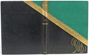 maroquin vert malachite et maroquin noir séparés par une bande en veau doré, plat sup. orné de quelques filets dorés courbes, doublures de tissu broché dans les noirs et or sertis de maroquins vert et noir et filets dorés, doubles gardes de papier marbré dans les noirs et or, tranches dorées, couv. et dos cons. (maroq. vert passé sur le dos qui est lég. frotté, les plats et les bords inf.). Sous étui bordé (abimé).