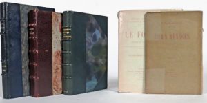 (1). Lettres de ma chaumière. Paris, Laurent, 1886, in-12° relié par Ed. Klein en demi-maroquin vert bleuté à coins, dos à nerfs, tête dorée, couv. et dos cons. (dos lég. passé). Certains des 21 contes de cet ouvrage seront réédités mais d'autres sont restés, selon la volonté de l'auteur, à jamais non réimprimés (# Talvart XV-247). Ex. du tirage courant (il n'a été tiré que 15 Hollande); ex-libris Raoul Simonson et Pierre Standaert.— (2). Le Foyer. Comédie en trois actes [...]. P., Charpentier & Fasquelle, 1909, in-12° br. (décharge de la couv. sur la garde bl.). Edition en partie originale parue un an après la princeps et avec l'acte supprimé lors de la représentation en 1908; 1/30 sur Hollande (3e pap., n° 18).— (3). Vieux ménages, Comédie en 1 acte. Paris, 1901, in-12°, plaquette br.— (4). Dingo. Paris, 1913, in-12° demi-maroquin brun-rouge à coins, filet doré sur les plats de papier marbré, dos à nerfs, t. dorée, couv. et dos cons.— (5). La Vache tachetée. Paris, [1918], in-12° demi-maroquin bleu outremer à coins, dos à 4 nerfs, témoins cons., couv. et dos cons. (dos lég. passé, mors lég. frottés, gardes et faux titre brunis). 1/70 (sur 80) sur vergé d'Arches (2e pap., n° 72).