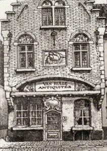 Première édition illustrée, soit 28 eaux-fortes tirées en brun-noir : plat sup. de la couv., 21 hors-texte, 3 bandeaux et 3 culs-de-lampe. Tirage à 280 ex. num., un des 80 de l'unique tirage de tête hors commerce nominatifs, spécialement tirés sur Hollande pour les membres de la Société des Bibliophiles et Iconophiles de Belgique (n° 4 pour Eugène Resteau), accompagnés de : - 1 suite des eaux-fortes en bistre avec remarques. Enrichi de 1 suite des eaux-fortes en noir en 1er état. • Les gravures de l'aquafortiste belge de talent Louis Titz (1859-1932) rendent bien l'atmosphère des petites ruelles de Bruges surplombées par l'imposant beffroi.