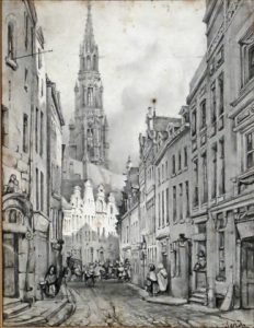 (Bruxelles) - SERDA, Émile (France, 1804-1863).- Scène animée dans la rue de la violette avec la Grand-Place dans le fond. [Circa 1850]. Dessin original, mine de graphite, 28,5 x 22 cm, signé en bas à dr., étiq. explicative au verso du cadre...
