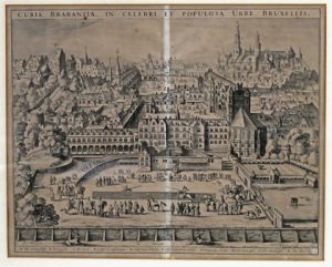 La situation représentée est celle du milieu du XVIe s. On y voit le magnifique palais du Coudenberg, considéré par Dürer comme l'un des plus jolis d'Europe mais qui brula entièrement en 1731, l'Aula Magna, le parc de la Warande et les grands alentours, le grand hotel de Nassau et les hotels de Fuentes et de Croy-Aarschot, etc. Avec une joute de chevaliers à l'avant-plan. # Hollstein 168.