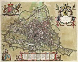 Important plan de Gand très détaillé, avec légende de 81 toponymes, lieux, monuments... extrait du "Novum ac magnum Theatrum urbium Belgicae" ou "Stedeboeck". # van der Krogt 1505:43. Joint : BRAUN, Georg; HOGENBERG, Frans.- Alostum, urbs Flandriae imperatoriae firmissima. E.-f., cuv. 33 x 42 cm + marges, rehaussée à l'aquarelle (petit manque de papier au pli central renforcé, déch. sans manque restaurée). Plan à vol d'oiseau extrait du célèbre atlas "Civitates Orbis Terrarum" édité entre 1572 et 1618 (f. 10 avec texte en latin au verso).