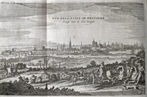 Vertaling uit het Frans geïllustreerd met 190 kopergravures op 99 platen door o.m. Harrewijn, Bouttats, Cause en Erlinger van stadsplattegronden, zichten van stadhuizen en kastelen en stedelijke wapenschilden. Met een uitgebreide historische, chronologische, geografische en genealogische beschrijving van de hoofdplaatsen en heerlijkheden der 4 kwartieren van het oude Hertogdom Brabant. fl Important ouvrage chorographique traitant des 4 quartiers de l'ancien duché de Brabant, illustré de 190 sujets sur 99 planches : plans, vues d'hótels de ville et de chateaux, ainsi que des armoiries des villes. Demi-veau de l'ép. (incomplet d'1 pl. d'armoiries, qqs taches, qqs ff. lég. brunies, rel. us.).