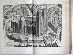 Unique édition de cette remarquable histoire de la ville de Bruxelles et de ses sept lignages, par le professeur Eric van de Putte, successeur de Juste Lipse à la chaire des lettres latines de l'Université de Louvain. Elle est illustrée d'1 vignette de titre (armoiries de Bruxelles accolées de lions, par W. Hollar),- 3 doubles pages (vue panoramique de la ville par A. Santvoort, vues plongeantes sur la collégiale Sainte-Gudule et sur la cour intérieure de l'ancien palais du Coudenberg),- 2 pleines pages (Maison du Roi et Hotel de ville),- 2 in texto (vue de la façade arrière du palais par la Warande et armoiries des 7 lignages). "L'ouvrage est un griphus, sorte d'énigme; tout y est ramené à l'"Heptade", au chiffre sept" (cfr BB). # BB IV-812/813; # Funck 381-382.