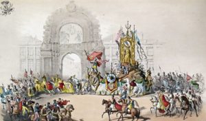 Édition originale illustrée d'un portrait du roi sur Chine appliqué (lithogr. en noir d'après la photographie de Ghémar & Servais),- du titre gravé lithographié par Jules Helbig en noir et blanc sur fond teinté protégé par une serpente,- d'1 lithographie en noir sur double page par Simonau et Gerlier (réception du Roi à Laeken),- d'1 lithographie rehaussée, partiellement gommée, sur double page (cérémonie Place de la Société civile par Léon Suys),- et de 21 lithographies rehaussées, partiellement gommées, par Gerlier (10), Canelle (8), Toovey (2) et Claessens (1). Toutes les planches sont imprimées par Simonau & Toovey. Le cortège et les chars retracent l'histoire de la Belgique depuis les Francs jusqu'à l'époque contemporaine en passant par la célébration de l'Ordre de la Toison d'Or. # pas dans la Bibliogr. nat. ni van der Marck.