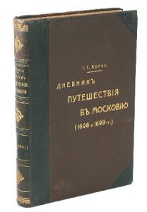 Korb, Johann Georg Diarium itineris in Moscoviam... [Traduction russe de A.Maléine.] St.Pétersbourg,A.Souvorine, 1906. In 4° de 322 pp.Avec les 19 planches de l’édi-tion originale superbement reproduites. Magnifique édition russe organisée par