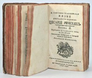 G. Svetoni Tranquilli De Vita Duodecim Caesarum Romanorum ; traduites de la langue latine en russien par Mi-khailo Ilynsky, conseiller titulaire et préfet du sémi-naire Sainte-Trinité. St.Pétersbourg, 1776. 2 parties en 1 vol. Manque le titre de la