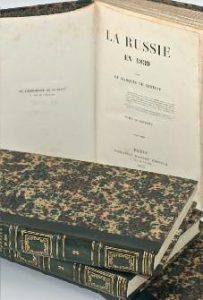 marque de possession frappée en queue, tranches marbrées. édition Originale du chef-d’oeuvre du marquis de Custine et de l’un des écrits politiques les plus importants.Alexandre Sokourov afait le marquis de Custine l’un des héros de son filme L’Arche russe (2002). Bel exemplaire de cet ouvrage très recherché conservé dans ses élégantes reliures de l’époque. Кюстин,Астольфде(1790-1857). [Россияв1839году.] Париж, 1843. - 4 т.: Xxxii, 354+416+470+544 с., 1 л.табл.; 8° (21,5 см). - На фр.яз. в 4-х полукожаных переплетах эпохи с бинтами и зол.тиснением по корешку. Шелковое ляссе. Владельческий ин- скрипт на свободн.листе 1-го тома. Несущественные потертости переплетов, небольшое повреждение корешка у т.1, временные пятна. ПЕРВОе ИЗДАНИе знаменитейшего сочинения маркиза де кю- стина о его поездке в Россию. Высказывания Кюстина о России («империя фасадов» и проч.) вызвали бурную полемику…кото- рая продолжается до сих пор (так, режиссер а.Сокуров ведет спор с критичным маркизом в своем фильме «Русский ковчег»).