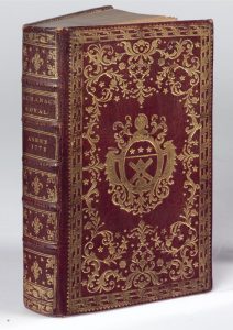 Superbe reliure aux armes des Moulinier, vermicelliers à Marseille, en maroquin rouge orné de fers rocaille. Calendrier interfolié. Le volume porte la belle marque gravée À la teste noire du papetier et marchand d'almanachs Larcher contrecollée à une garde. Très bel exemplaire, malgré d'infimes frottements.