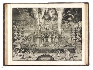 Un des plus beaux livres de fête hollandais de l'âge baroque, remarquablement illustré par Romeyn de Hooghe. Édition originale et premier tirage de l'illustration, composée d'un portrait de Guillaume III interprété en taille-douce par P. van Gunst d'après J. Brandon, d'un frontispice allégorique par Romeyn de Hooghe « qui ne serait point indigne de Rubens », écrit Vinet, et de 14 grandes planches hors texte dessinées et gravées à l'eau-forte par le même artiste, dont 11 à double page. Ce livre célèbre l'entrée de Guillaume III d'Orange-Nassau, stathouder des Provinces-Unies et roi d'Angleterre, dans la ville de La Haye – entrée qui « se distingue entre toutes, selon Vinet, par la profusion des peintures et figures allégoriques, des emblèmes et devises qui courent et surchargent les arcs de triomphe ». Bel exemplaire dans une jolie reliure hollandaise du temps. Petites restaurations et épidermures à la reliure, réparation marginale à un feuillet. Landwehr : Romeyn de Hooghe, n°79 – Landwehr : Splendid ceremonies, n°146 – Vinet, n°752.