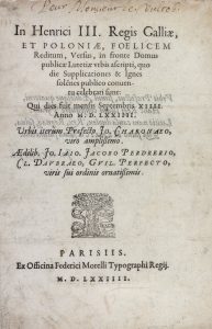DORAT (Jean) et Jean-Antoine de BAÏF. In Henrici III Regis Galliæ, et Poloniæ, fœlicem reditum, versus, in fronte Domus, publicæ Lutetiæ urbis ascripti, quo die supplicationes & Ignes sole[m]nes publico conventu celebrati sunt. Paris,...