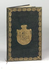 Sicilia in quest' anno 1824. Palerme, héritiers d'Abbate, [1824]. Plaquette in-8 de 20 pp., reliure-chemise de maroquin à long grain vert, roulette dorée à fer ogival et fleurs de lis aux angles, armoiries au centre, dos lisse muet, cordelette dorée, tranches lisses (Reliure de l'époque).