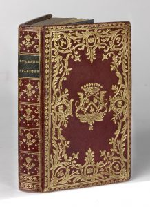 armoiries au centre, dos lisse orné, pièce de titre verte, filet sur les coupes, roulette intérieure, doublures et gardes de tabis bleu, tranches dorées (Reliure de l'époque).