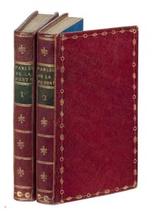 LA FONTAINE (Jean de). Fables choisies, mises en vers. Genève, s.n. [Paris, Cazin], 1777. 2 volumes in-24, maroquin rouge, chaînette dorée en encadrement, dos lisse orné d'urnes dorées, pièces de titre et de tomaison vertes, coupes décorées,...