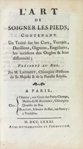 LAFOREST (Nicolas Laurent). L’Art de soigner les pieds, contenant un traité sur les cors, verrues, durillons, oignons, engelures, les accidens des ongles & leur difformité. Paris, chez l'auteur, Blaizot, 1781. In-12, veau fauve, triple filet...