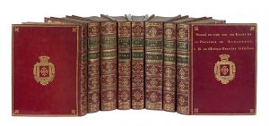 Édition originale d'un des plus importants recueils de documents sur l'histoire juridique du Languedoc. Ces sept volumes, compilés par l'avocat et jurisconsulte montpelliérain Jean Albisson (1732-1810), forment tout ce qui a paru de l'ouvrage, le huitième tome annoncé n'ayant jamais vu le jour. Somptueux exemplaire de présent en maroquin aux armes du Languedoc et croix de Toulouse offert en 1787 au fermier général Clément Cugnot de l'Épinay, avec ex-dono doré sur les plats supérieurs des volumes et l'ex-libris manuscrit de son fils, Armand-Thomas de l'Épinay, sur le faux-titre du quatrième tome. De la bibliothèque de Martignac, avec ex-libris armorié. Exemplaire très bien conservé, malgré quelques défauts d'usage et petits accidents aux coiffes. On y a joint un second exemplaire du quatrième tome, relié à l'identique et de même provenance.