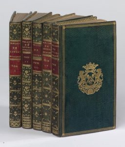 [MILLIN (Aubin-Louis)]. Mélanges de littérature étrangère. Paris, Gogué et Née de La Rochelle, Belin, Hardouin, 1785-1786. 5 volumes in-12, maroquin vert, triple filet doré, armoiries au centre, dos lisse orné, pièces de titre et de tomaison...