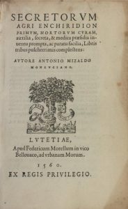 MIZAULD (Antoine). Secretorum agri enchiridon primum, hortorum curam, auxilia, secreta, & medica præsidia inventu prompta, ac paratu facilia, libris tribus pulcherrimis complectens. Paris, Frédéric Morel, 1560. In-8, vélin souple à...