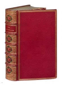 Daniel Elzévier], 1657. Petit in-12, maroquin rouge, triple filet doré, dos orné aux petits fers pointillés, quatre caissons contenant un cartouche de maroquin rouge bordé d'un listel de maroquin vert mosaïqué et frappé de la mention Elz. 1657 ou d'une fleurette dorée, filets sur les coupes, dentelle intérieure dorée, tranches dorées sur marbrure (Lortic).