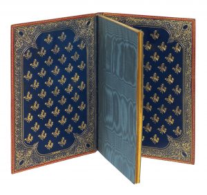 d'une large bordure à fond criblé et semées d'un fer à l'oiseau doré répété, gardes de moire bleue, tranches dorées (P. Eenhaes).