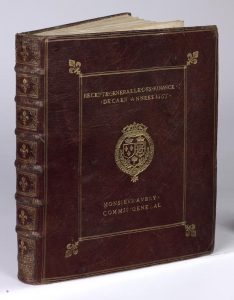 mentions dorées « Recepte Generalle des Finance de Caen Années 1665 » et « Monsieur Aubry Commis General » de part et d’autre du plat supérieur, dos orné de fleurs de lys dorées, roulette sur les coupes, tranches dorées (Reliure de l'époque).