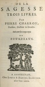CHARRON (Pierre). De la sagesse. Trois livres. Suivant la vraye copie de Bourdeaux [sic]. Amsterdam, Louys et Daniel Elzevier, 1662, petit in-12, [16 (dont titre-front. et titre)]-622-[8] p., plein maroquin rouge janséniste, dos à nerfs, titre...