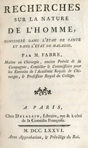 FABRE [(Pierre)]. Recherches sur la nature de l'homme, considéré dans l'état de santé et dans l'état de maladie. Paris, Delalain, 1776, 8°, [6]-430 (les pp. 429-430 contenant la table de l'ouvrage sont placées en tête)-[4] p., pleine basane...