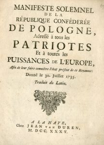 Juillet 1735. Traduit de latin. La Haye, Jean van Duren, 1735, 8°, 20 p., br., couv. muette. Comme le prévoyait le "traité des trois aigles noirs" de 1732, la Russie, la Prusse et l'Autriche violèrent ouvertement la souveraineté polonaise lors des élections de 1733. Stanislas Leszczynski y obtint la majorité des votes, mais la Guerre de succession de Pologne (1734-1735) l'écarta au profit du roi de Saxe Auguste III, candidat des puissances.