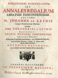 JOHANNES A LEYDIS. Chronicon Egmundanum seu Annales regalium abbatum egmundensium [...]. Lugduni Batavorum [à Leyde], Apud Fredericum Haaring, 1692, petit 4°, [16]-267-[1 blanche] p. (1 f. non chiffré entre les pp. 156 et 157), plein veau brun de...