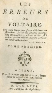 titre (qq. accrocs et traces d'usure et de frottement). Édition liégeoise de ce célèbre livre de polémique. Claude-Adrien Nonnotte (Besançon, 1711-1793) est un prêtre catholique et controversiste. Jésuite, il prêcha à Amiens, Versailles et Turin. On le connaît surtout pour ses écrits contre Voltaire. Quand ce dernier eut commencé à faire paraître son « Essai sur les moeurs » (1754), une attaque contre le christianisme, Nonnotte édita, anonymement, « Examen critique ou Réfutation du livre des moeurs »; et quand Voltaire eut fini sa publication (1758), Nonnotte mit à jour son livre et le fit rééditer à Avignon (2 vol., 1762), s'efforçant de réfuter toutes les erreurs en histoire et en doctrine qu'il relevait dans le travail de Voltaire. Voltaire y répliqua dans ses « Éclaircissements historiques », et pendant vingt ans la polémique se continua.