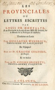 Guillaume Wendrock [Pierre Nicole], théologien de Saltzbourg [sic]. En espagnol par le Sr. Gratien Cordero, de Burgos. Et en italien par la Sr. Cosimo Brunetti, gentil-homme florentin. Cologne, Balthazar Winfelt, 1684, 8°, [40]-613-1 blanche p., pleine basane brune de l'époque, dos à nerfs doré (qq. accrocs et minimes traces d'usure). Signatures anciennes dont au titre « Sanson de Lorchere ». Intéressante édition quadrilingue. La première. Les Lettres écrites par Louis de Montalte à un provincial de ses amis, et aux RR. PP. Jésuites sur le sujet de la morale et de la politique de ces Pères, titre généralement abrégé en Provinciales, sont un ensemble de dix-huit lettres fictives, écrites par Blaise Pascal. Publiées entre janvier 1656 et mars 1657, elles ont d'abord eu pour but de défendre le théologien janséniste Antoine Arnauld, menacé d'être condamné par la Sorbonne, avant de s'orienter vers une critique de la Compagnie de Jésus, et en particulier de la casuistique laxiste défendue par ses membres (Maire, II, 212-3).