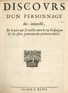 Pays-Bas.- Traité de Münster. Discours d'un personnage des-interessé, sur la paix qui se traicte entre le roi d'espaigne et les estats generaux des provinces unies. S.l., 1647, 8°, 24 p., br., couv. muette./ Traicté de la Paix conclu le...