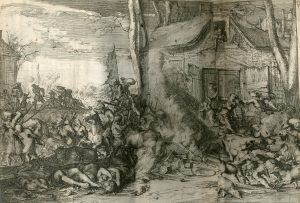van 't leger van den Koning van Vranckrijck door Brabandt en Vlaendren. [Amsterdam], sans édit. (marque à la sphère), 1674, in-12, 217-1 blanche p., 7 planches (sur 8) plusieurs fois rempliées de Romeyn de Hooghe, demi-veau brun de la fin du 18e ou du début 19e s., dos lisse orné de palettes dorées, pièce de titre (une planche doublée, qq. renforts, une petite déchirure à une planche, reliure frottée). Abraham van Wicquefort (1606-1682) was een Nederlandse diplomaat, in dienst van George Willem van Brandenburg, nieuwsagent en historiograaf. Hij bewoog zich op het gebied van illegale nieuwsvoorziening en werd daarvoor twee keer veroordeeld. Wickefort zat opgesloten in de Bastille en de Gevangenpoort. Il s'agit d'une oeuvre de propagande relatant la guerre faite par les Français. Les gravures illustrent les horreurs perpétrées lors de la guerre menée par Louis XIV dans les Pays-Bas dans les années 1671 à 1679. L'édit. en langue française est parue un an avant avec les mêmes illustrations : 7 (sur 8) pl. dépl. de Romeyn de Hooghe dont 2 avec une double illustration ; 4 pl. sont signées et datées de 1673.