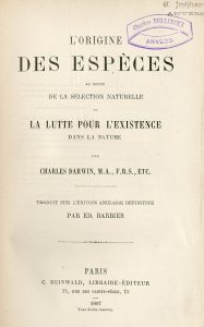 DARWIN (Charles). De l'origine des espèces par sélection naturelle ou des lois de transformation des êtres organisés. Trad. sur l'édition anglaise définitive par Ed. Barbier. P., Reinwad, 1887, 8°, XXI-604 p. + catalogue édit., rel. édit.,...