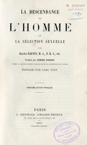 DARWIN (Charles). La Descendance de l'homme et la sélection sexuelle. 3e édit. P., Reinwald et Cie, 1881, 8°, 721 p., figures in-texte en noir, pleine percaline verte d'édit., cachet ex-libris (rousseurs sur les tranches).