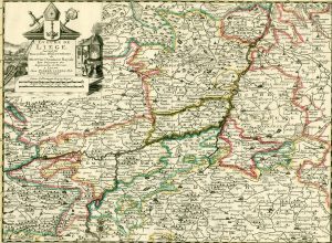 Liège.- L'Evêché de Liége, suivant de Nouvelles Observations de Messieurs de l'Académie Royale des Sciences. Leide, Pierre Vander Aa, s.d., (18e siècle), cartouche gravé sur bois, contours en couleurs, sous cadre brun. Dim. : 23 x 29,5 cm.