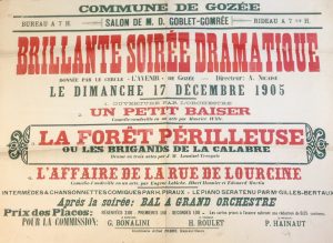 Placards.- Ensemble de 18 placards relatifs aux communes de Marbaix-la-Tour (6), Gozée (8), Fontaine-l'Evêque (1), Berzée (1), Beignée (1) et Thuin (1). Programmes, ordonnances et avis divers : matinée de charité, matinée artistique,...