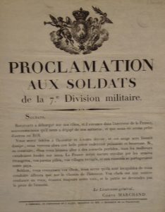 noir. "Soldats, Bonaparte a débarqué sur nos côtes, et il s'avance dans l'intérieur de la France, souvenons-nous qu'il nous a dégagé de nos sermens, et que nous en avons prêté d'autres au Roi. Vous serez fidèles à l'honneur et à votre devoir [...sinon] la France serait encore envahie par les armées étrangères, vos parens pillés, vos villages ravagés [...].