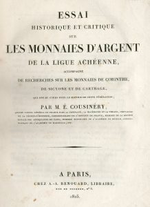 COUSINERY (E.). Essai historique et critique sur les monnaies d'argent de la Ligue achéenne, accompagné de recherches sur les monnaies de Corinthe, de Sicyone et de Carthage qui ont eu cours pour le service de cette fédération. P., A. Renouard,...