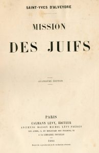SAINT-YVES D'ALVEYDRE. Mission des juifs. 4e édit. Paris, Calmann Lévy, 1884, fort grand 8°, portrait, 947 p., br. (couv. refaite, les anciens plats avant et arrière remontés, rousseurs). Joseph Alexandre Saint-Yves d'Alveydre (1842-1909) est un...