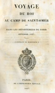 Voyage du Roi [Charles X] au Camp de Saint-Omer et dans les départemens du Nord. Extrait du Moniteur. Paris, Impr. Royale, 1827, 8°, 237 p., demi-basane brune, dos lisse, titre et filets dorés (lég. rousseurs). Recueil des discours des autorités...
