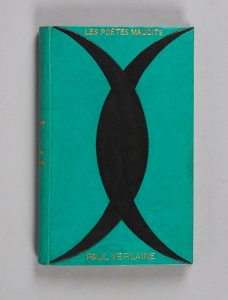 VERLAINE (Paul).- Les Poètes maudits. Nlle ed. 6 portraits de Luque. P. Vanier 1888 in-12 ; vélin vert, croissants de lune noirs enlacés sur les plats. Dos lisse. Gardes et contregardes kraft noir. Couvertures et dos sonservées. Etui. [S....